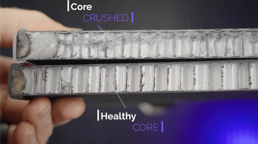 Core crushing happens when the honeycomb cells inside the polymer core become crushed. This can happen at the factory during manufacturing or over time with use.