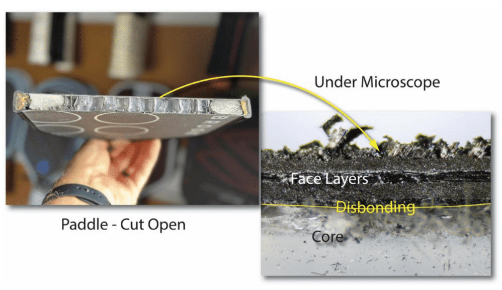You can often easily slip a knife between the surface layers and the core on a disbonded paddle, as shown below on a paddle we cut open.