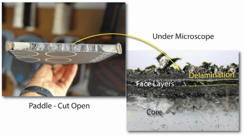 You can see what this looks like in the image. The honeycomb cells are collapsed and broken down. That’s what gives core-crushed paddles their springy power.